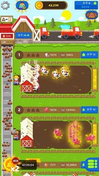 在玩家金币累计到一定程度,可以针对农场的条件进行水平升级”,提升动物农场的水平可以增加动物们的数量,并增加生产产量,同时也有速度效率的提升。