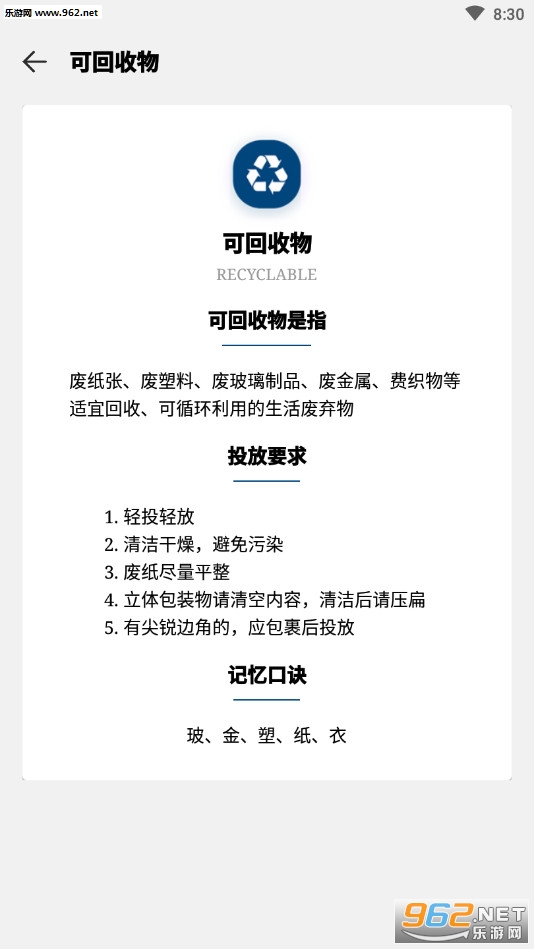 《乐色app》是一款为朋友们打造的垃圾分类指南软件,软件中有着各种不同垃圾分类的说明,朋友们可以在软件学习垃圾的各种分类方法,还可以直接输入垃圾名字进行搜索查询,快速了解什么垃圾扔在什么垃圾桶内。