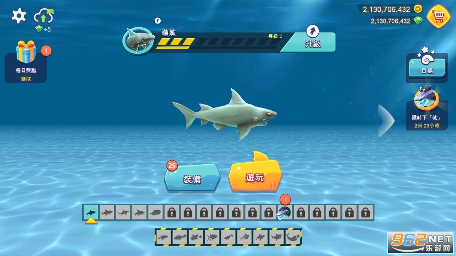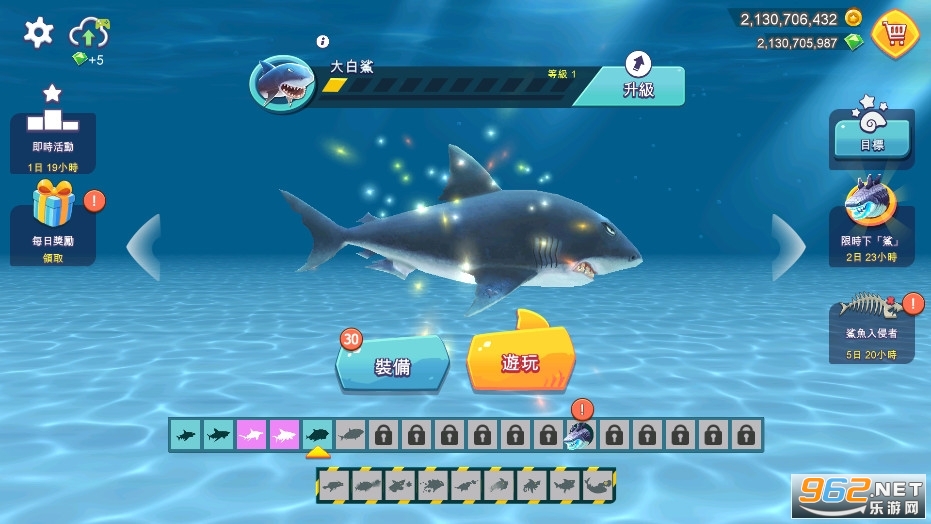 完成50个任务,寻找宝物取得金币与宝石,用来升级你的鲨鱼或者购买特殊救生道具。