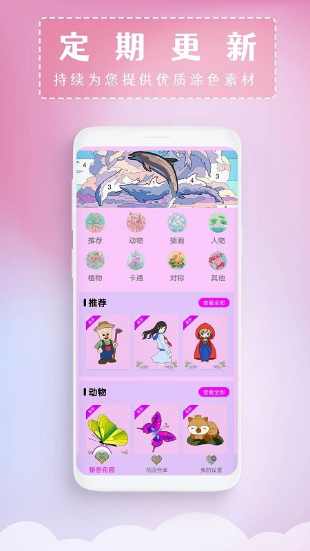 【海量图片 等你来涂】无论是插画、动物、花朵、人物,还是小编推荐的精美图片,只要你选择该分类,就有上千种图片等你来填色,每张图片都色彩丰富,让你一饱眼福!