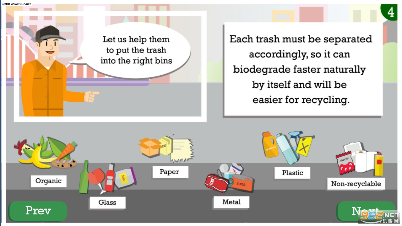 《清洁先生》(Mr GarbageMan)是一款卡通风格的休闲模拟游戏,游戏中玩家需要扮演清洁先生对扔过来的垃圾进行分类,将垃圾放入指定的垃圾箱中,虽然和上海的分类有所不同,但是也是一种垃圾分类的方式,赶快下载体验吧!