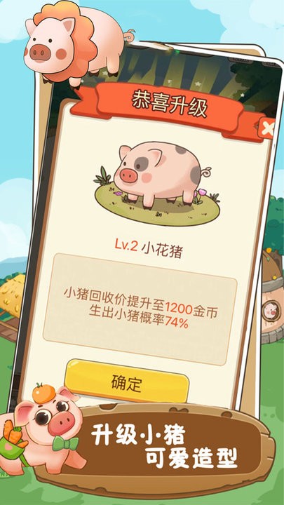 自动生钱:猪场上的猪会不断生出普通小猪和小金猪,普通小猪可自动兑换成金币,小金猪可自动兑换大量金币