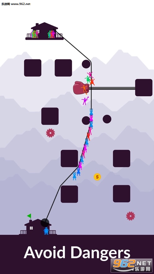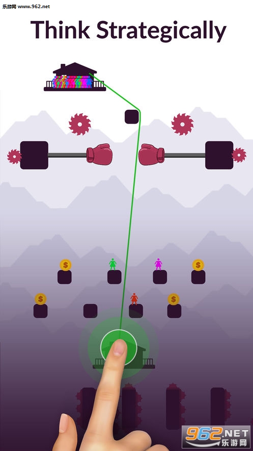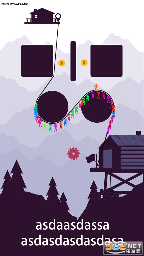 用手指画一条线,点击屏幕让乘客走上滑索。你的绳索必须保证所有的乘客都能安全到家,到达另一个家后,你的手指在屏幕上停留时间越长,乘座滑索的乘客就越多。为了避免危险,你可以在区块周围绘制线条,你可以像绳索一样移动线条。此游戏机以鞭打绳索为基础。