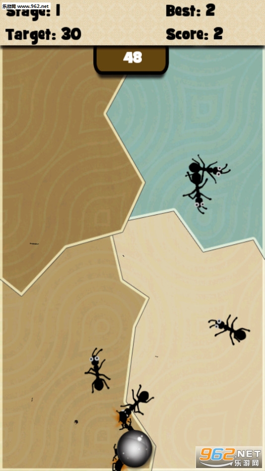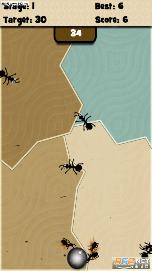 到处都是蚂蚁,快用铁球碾碎蚂蚁,屏幕上爬满了蚂蚁,利用重力感应控制铁球滚动来碾压蚂蚁,小心不要让铁球落入洞中。