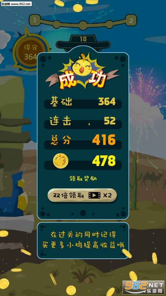 趣味的点击游戏,小鸡会不断的从货车飞出,玩家需要在小鸡所在的位置滑动,将小鸡转入车中,每个关卡会有着一定的小鸡数量,完成后会获得奖励,喜欢的朋友可以下载试试。