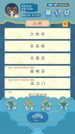 武侠人生模拟器内置作弊菜单是一款武侠类型的趣味游戏,玩家在游戏里可以去进行武林的秘籍的体验,还提供了多样的场景建筑解锁升级系统,你可以选择不同的营生方式,修习各种武学功法,完成各种任务挑战,闯荡江湖拜师学艺。