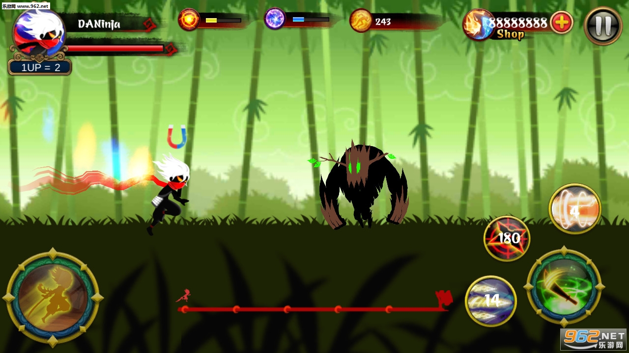 《忍者的战斗》是一款卡通风格的跑酷战斗游戏,游戏的玩法是跑酷加上战斗,通过在跑酷中使用攻击和忍者的各种忍术来清理前方的障碍,游戏中还有着各种各样的boss等待你的挑战,游戏操作简单便捷,还在等什么呢?赶快下载体验吧!