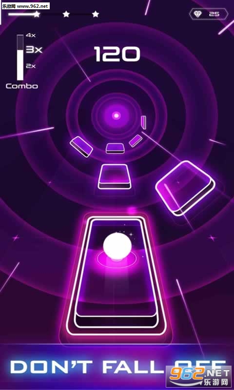 这是一款敏捷游戏,选择一首你喜欢的音乐,点击屏幕控制球球在平板上前进并在合适的时机跳跃到别的平台上。你的目标就是在平板上坚持尽可能久的时间,一旦从平板上掉下来,你将要重新开始游戏。