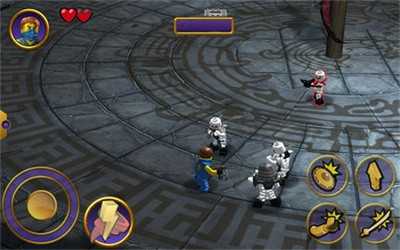 尽管人物是乐高积木效果,但战斗过程十分流畅自然。游戏采用经典的RPG动作类游戏操作方式,左下角摇杆控制走位,右下角设置攻击、跳跃、防御等技能按键,位置合理且操作顺滑。