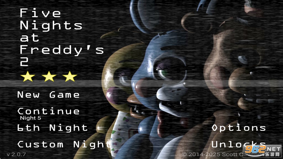 《玩具熊的五夜惊魂2Five Nights at Freddy&39;s 2》是一款PC移植的动作冒险游戏,游戏主要以恐怖为主,在游戏中营造了一种很好的氛围!主人公是是一个披萨店的监控保安,这家店为了吸引孩子们而搞来了很多玩具熊,其实这些玩具熊的皮套下是AI机器人,玩家在午夜之后还要监控店铺内部,但是这些玩具熊莫名其妙地开始活动了,寂静的夜晚变得恐怖起来,而你则要这样子渡过五个晚上!!!