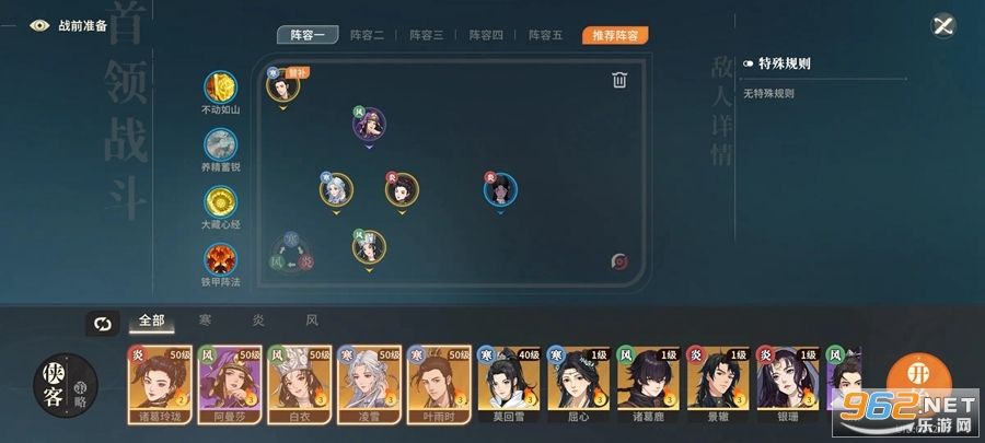 55官兵讨贼:金刚不坏(集火后使用)、不动如山+铁甲阵法(保证官兵存活)+任意,官兵越多回怒越快;