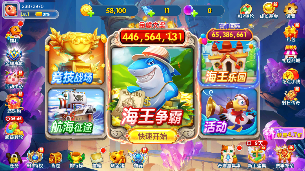 海王宝藏捕鱼是一款还原街机捕鱼机的休闲捕鱼游戏。多种渔场供挑选,鱼种丰富,击杀BOSS爆惊喜。更有趣味小游戏,是捕鱼玩家用手机就能体验的街机捕鱼。全新兑换系统,换道具换钻石更能赢话费,海量话费等你领!各类精彩活动,增加捕鱼游戏趣味。推出月卡功能,超值返利与优惠,提供畅快捕鱼新体验!