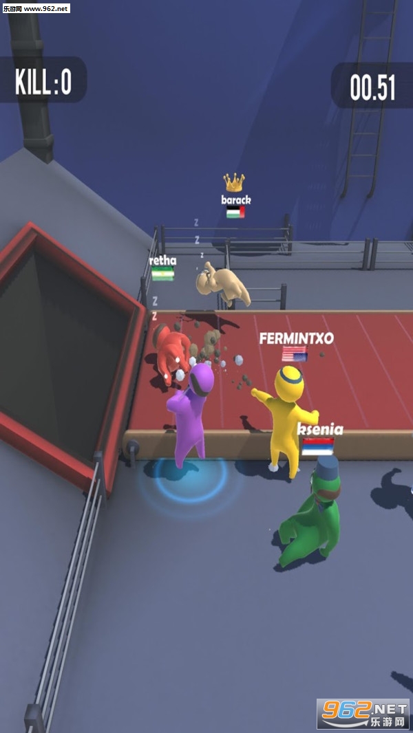 一款以物理玩法为主的联机大作战游戏,在游戏中所有的玩家将在同一个平台上战斗,一旦被扔出平台下就会失败,如果你连续被攻击就会晕倒,晕倒了就会被人扔出去,游戏的玩法非常清奇搞笑,玩起来欢乐无限,你也可以和好友一起并肩作战,团队配合玩起来更给力。