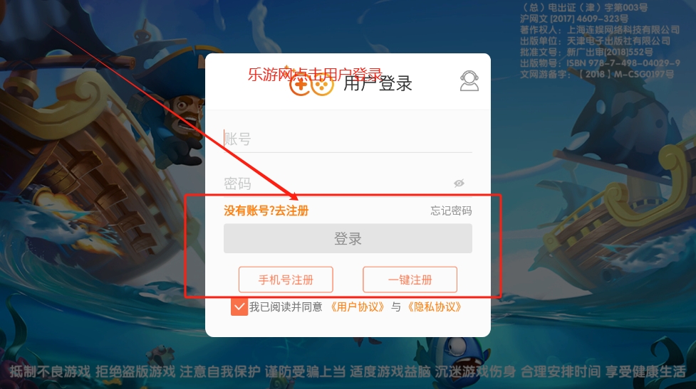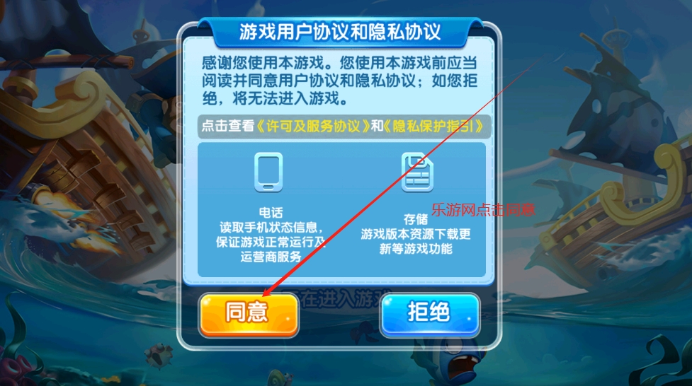 1、打开从962乐游网下载安装好的金鲨银鲨2游戏,阅读游戏用户协议和隐私协议进入。