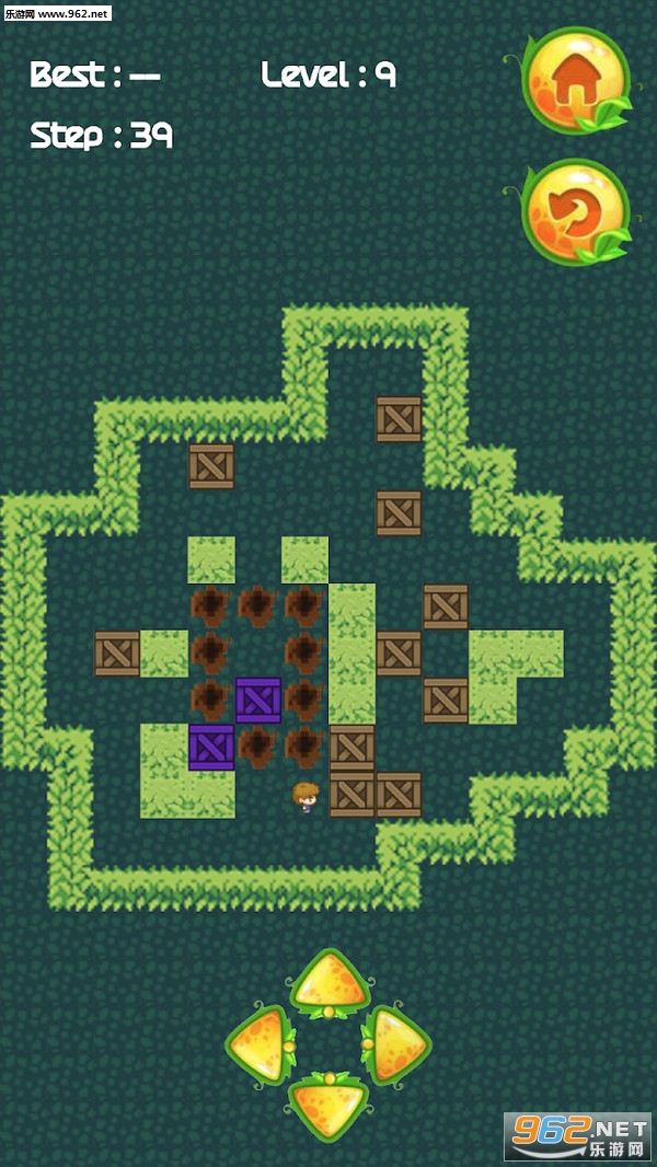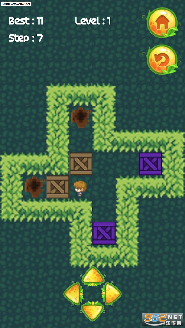 2、控制角色上下左右的进行移动,一次只能够推动一个箱子到达目的地。