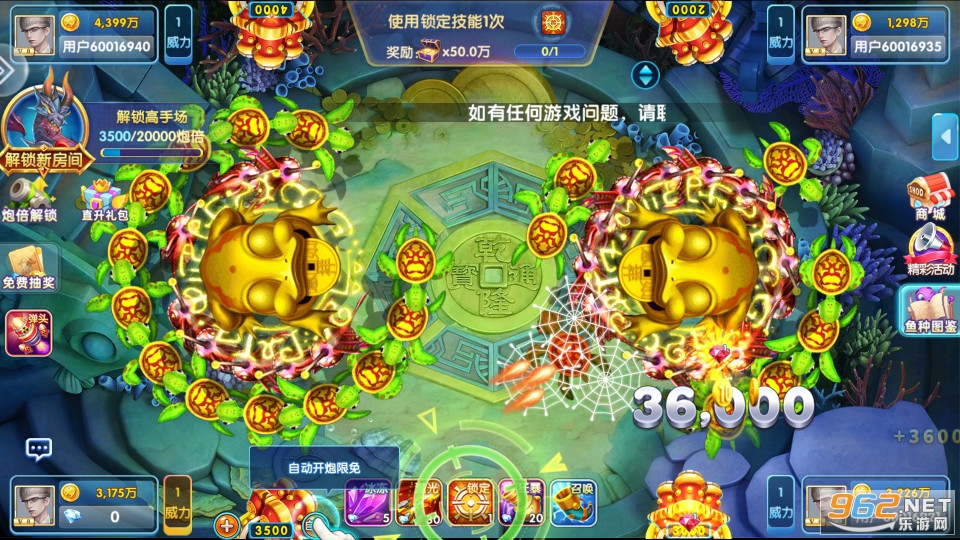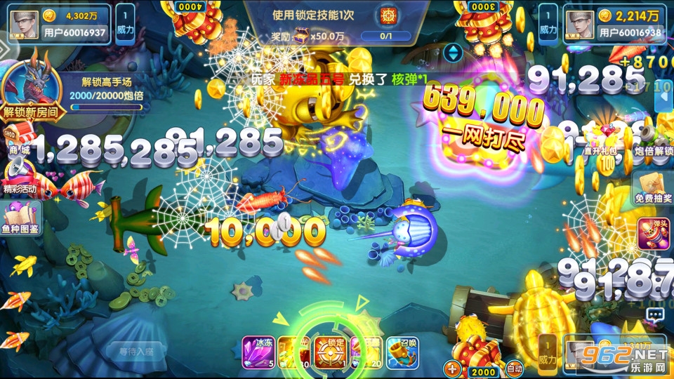 1、万人捕鱼、实时联网、趣味捕鱼、酷炫体验;