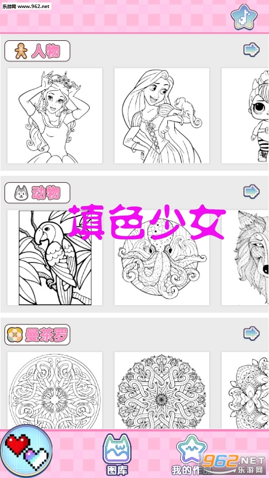 众多的图片库分类下都包含了众多的图片模板等你来涂,比如人物、风景、独角兽和曼陀罗等等类别,每日更新图片哦!