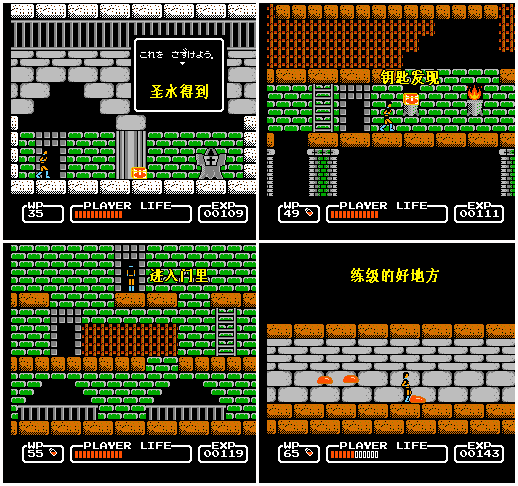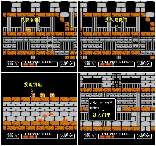 33.进入门10二次,第一次会得到钥匙的情报,第二次可和魔法师交易。用六枚金币换铁剑。(金币一枚枚给,使用铁剑可增加攻击力)