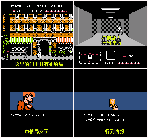 现在可以使用枪了,消灭敌人有时会得到弹药。途中会有一些门,里面是个小型3D场景,消灭里面的敌人也可以得到弹药。进入最右侧遇到中情局的女子,她交给主角情报。