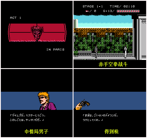 BOSS战时的操作有点不同,A键出拳、B键踢腿,↑是跳跃。BOSS战是有时间限制的,而且此时主角不能使用枪。无论敌我双方被打中后都会被击退,但是主角受伤会有短暂的无敌时间,而BOSS没有,利用这个特点完全可以和BOSS打埋身战,把BOSS避到墙角无限连死,BOSS根本没有还手的机会。(感觉有点忍龙的画风呢.)