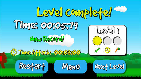 2、基于物理的性格和世界:玩家控制这只兔子在关卡中进行闯关,收集胡萝卜让兔子变得厉害
