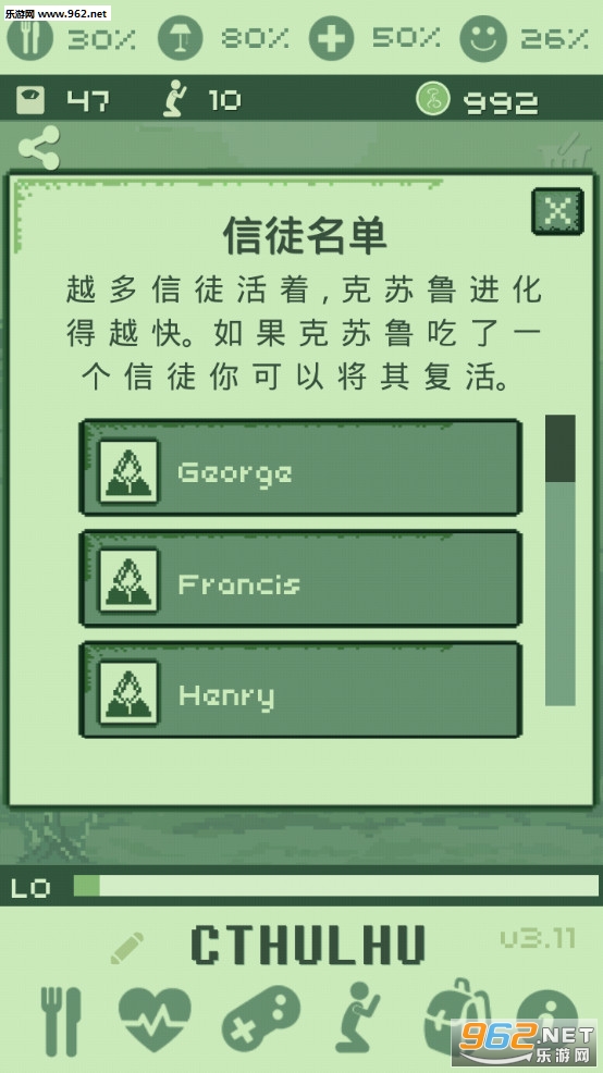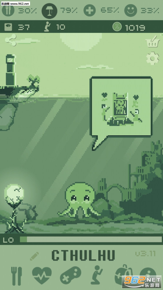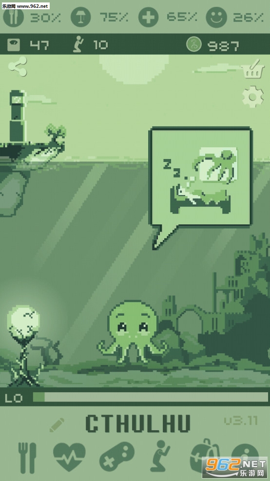克苏鲁虚拟宠物是NeuroCreativa开发的一款虚拟宠物养成游戏,游戏以远古邪神克苏鲁神话故事背景,采用上世纪90年代掌机单色怀旧画风,玩家将领养一只克苏鲁宠物,它的样子就像章鱼、蝙蝠的结合体,感觉新奇又有趣。与其他宠物养成游戏一样,你平时也要给它喂食、清洁、陪它玩游戏、睡觉,让它能够快乐的成长。此外,你也要关注克苏鲁健康度、体力、饥饿度等基本数值变化,最重要的是避免它沉睡,否则就永远也醒不来了。