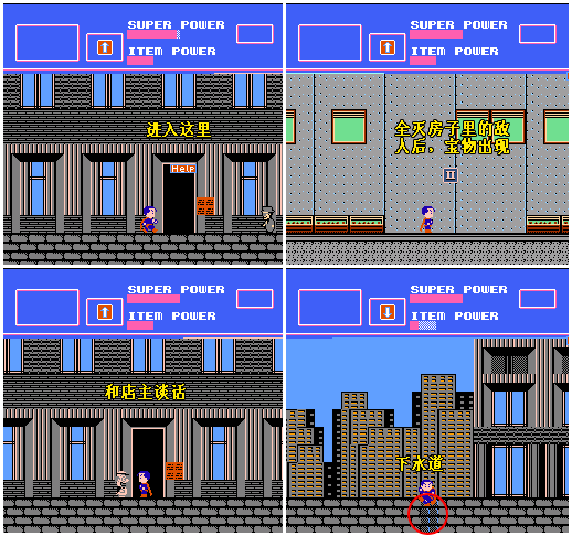 3.继续向右走,途中有个门会有HELP字样,进入后打倒里面的人,得到提升能量槽的宝物,出来后和店主谈话即可。下水道和电脑大楼都不要去,里面什么宝物也没有。