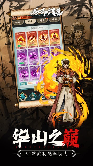 1、64种武功搭配各路侠客助力,踏足江湖武侠论剑。