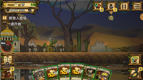 玩家的卡槽能放置5张卡牌,显示在屏幕正中间,使用卡牌时只需把卡牌拖至屏幕上即可。在开局时优先推荐打出经济卡获得金币收益接着再使用军事卡。