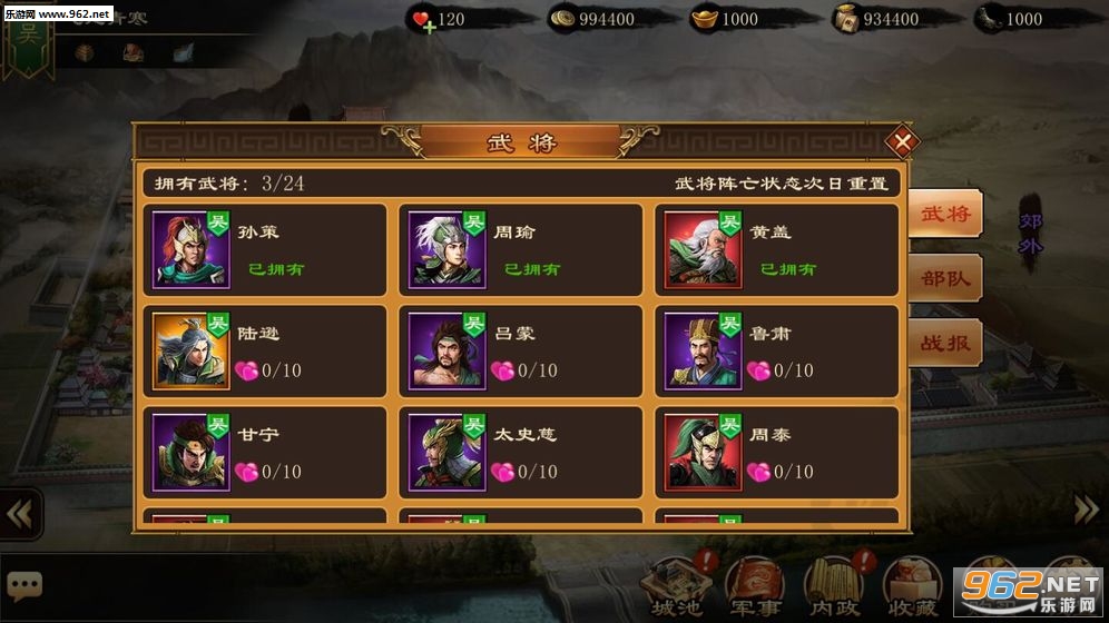 “攻伐敌国”中您可以派出作战部队去参与战斗,您需要指定三名带队武将,这三名武将会分别带领部队进行三轮战斗。战斗中被击败的武将有可能受伤,需要治疗才能再次上阵。与敌国战斗是获得武勋的主要方式,而武勋可以提升太守您的爵位,较高的爵位每天可以获得较多的黄金收入。而功绩可以提升您的官阶,使您的政令与军令有较大的效果。