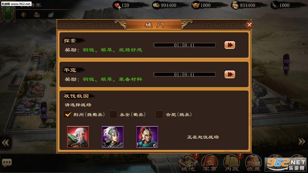 5、在“城门”你可以派遣任务队伍进行“探索”和“平寇”活动,在时间结束后您可以获得不错的收益。