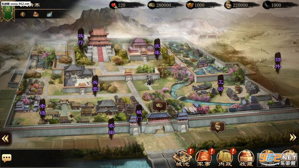 1、玩家作为太守治理一座城池,为开局时选择的魏蜀吴三大势力之一效力,可以通过城门-征伐与其他的势力的玩家交战并且可以通过迁城选项来选择不同的地形加成以获得对应的资源。每天签到可以得到一些资源,保持在线时也会发生一些稀有事件让您得到各类资源。城门和农田会持续地为您提供铜钱和粮草供您使用。