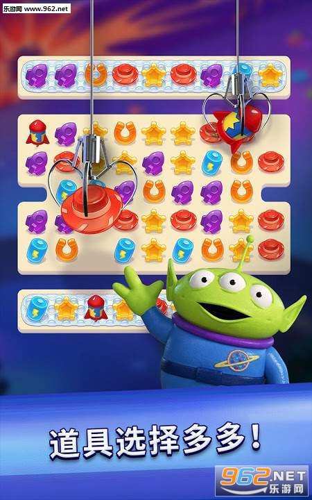召唤玩具道具来帮助你过关,用“抓手”来交换游戏单品,用“外星人飞碟”吸走需要清除的单品,用“神奇画板”随机打乱整个游戏版面获得更佳组合;