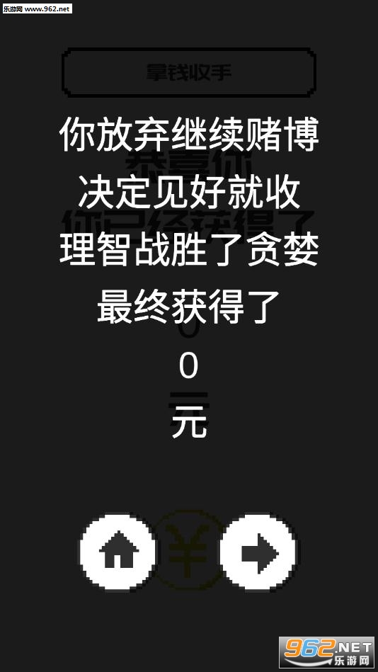 这款游戏其实没有很大的亮点,也不是很好玩,在无限模式中你扮演一个赌徒,是想一直赢钱下去,不放弃,还是拿着钱走人见好就收?如果不放弃的话有一定的概率会点击到死亡按钮,你将会失去所有的金钱,游戏的关卡模式不知道是个什么鬼,一直让你给五星好评。