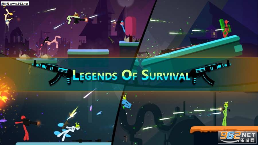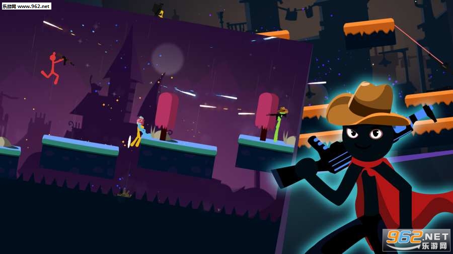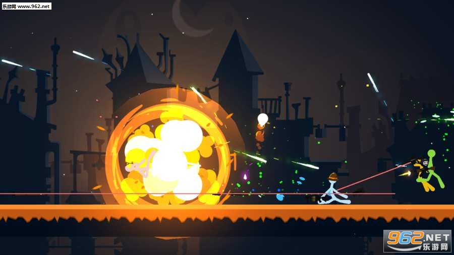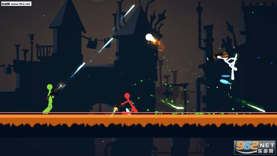 2、4名火柴人同时战斗,相互射击,武器会随掉落,包含了狙击枪、喷火器、冲锋枪等多种武器;