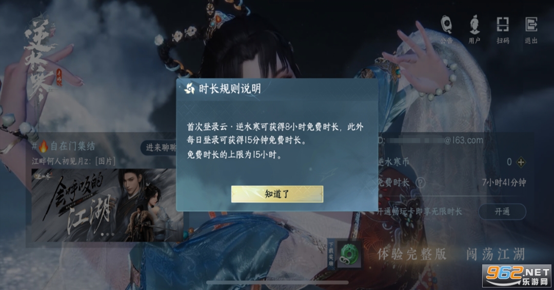 首次登录《云&12539;逆水寒》可领取8小时免费时长,此外每日登录可领取15分钟免费时长,免费时长的上限为15小时,当免费时长不足时,需购买逆水寒币或开通畅玩卡。