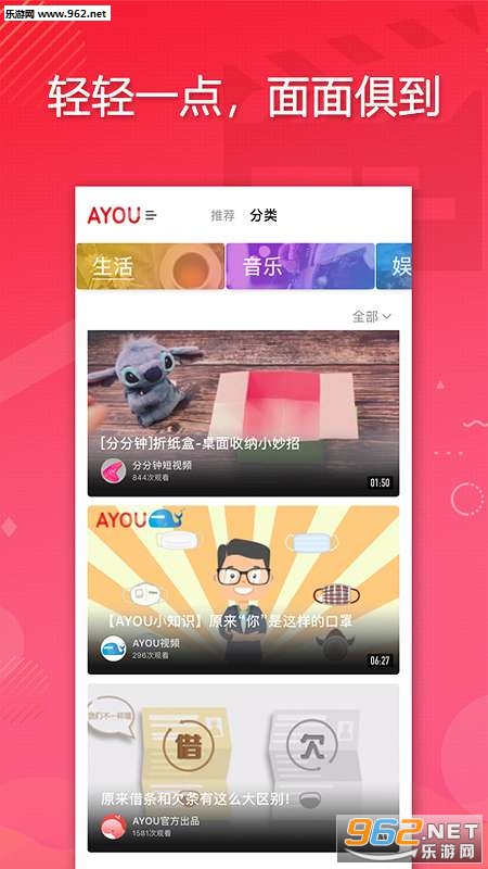 发现你的兴趣和热爱,美食,舞蹈,摄影,生活,娱乐,育儿,音乐,运动,办公(此处省略一万字…)….无论你喜欢的是什么,都可以在AYOU上找到内容和伙伴,只有想不到,没有看不到。不知道自己爱什么的人是茫然的,AYOU想做你肚里的小蛔虫。