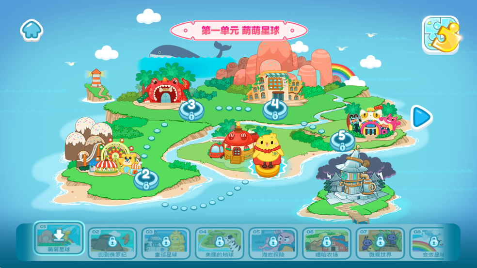 九大主题:萌萌星球、回到侏罗纪、童话星球、美丽的地球、海洋探险、美丽的农场、微观世界、气象大冒险、梦幻星球。