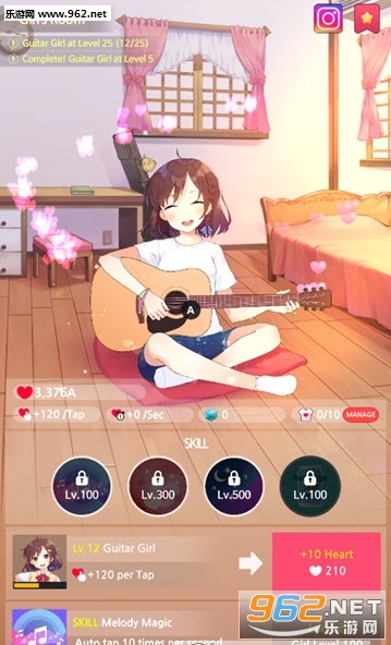 吉他女孩(Guitar Girl)是最舒适的放置点击游戏,你将和少女一起通过弹吉他来获取好感度和收益,并未少女不断的置办自己的房间,独特的装扮系统更是有趣,让少女打扮成不同的风格进行表演,同时游戏的音乐相当的赞,清新唯美的画风加上音乐和甜美的少女,没有比这更惬意的放置休闲游戏了!