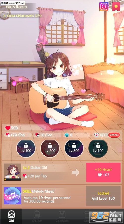 《吉他少女》(Guitar Girl)是一款卡通风格的休闲放置游戏,游戏中玩家可以不断的增加与少女的好感度,可以用来升级各种属性,游戏采用了放置的玩法,可以不断的增加房间内的饰品,还可以更换各种衣服,还在等什么,赶快开始游戏吧。