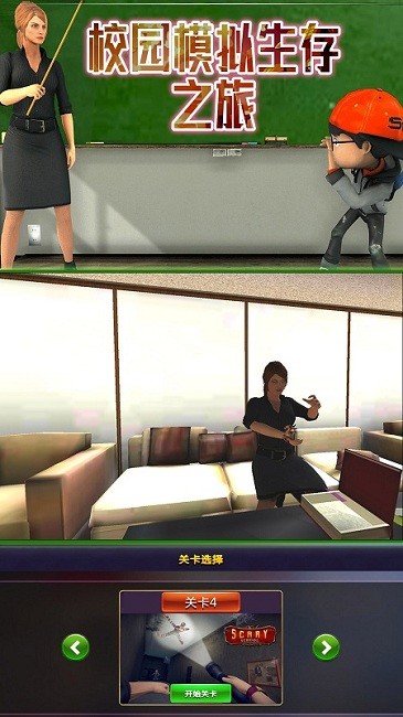 校园模拟生存之旅游戏是一个趣味性的校园模拟冒险游戏,游戏中的画面制作很精致,各种场景刻画的十分真实。这里有丰富的剧情故事,在这里有很多不同的关卡可以尽情挑战,每一关的玩法都不一样,想办法解开眼前的谜题就能顺利完成逃脱。