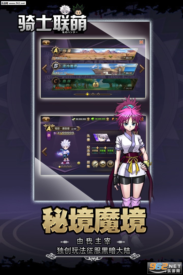 大型多人在线冒险动作漫画型手游热力首发!带你重回漫画场景,重温童年乐趣;多层次战斗副本,众多角色拥有念能力轮番斗技;原版主角本色登场;跌宕起伏的剧情,多对CP任由你来搭配!强化、变化、具现化,这是一款适合你的漫画风动作手游!