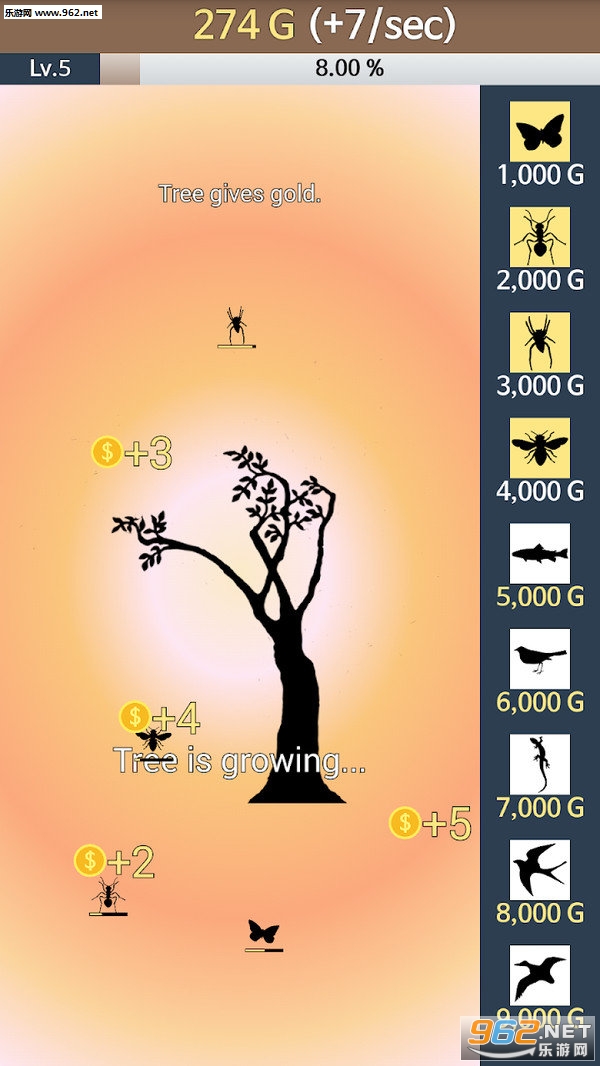 每次你点击树影,你会得到一个经验点。如果你的经验值是最大,你得到升级。级别越高,树阴影增长并获得更多的分支。作为升级,你可以从树影获得更多的钱。