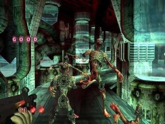 因为猪头三把这个游戏都背下来了,所以在打完一波怪后,会立即把准星调整到下一波丧尸刷新的位置,街机版是没有这个准星的,这是街机远远难于 PC 版的原因一。原因二是 PC 版子弹打完会自动上弹,而街机需要拉动模型枪的枪栓才能上弹。当然还有原因三,后面再说。
