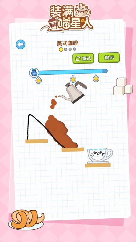 喵星人新开张了一家小小咖啡店!里面连杯子都是喵星人做的!小店除了有经典的美式咖啡,还有香甜可口的卡布奇诺!小店承诺,每一杯咖啡,都没有猫猫受到伤害《装满喵星人》是一款萌系闯关智力游戏,玩家需要通让咖啡配料准确的倒入杯子中,才能制作出美味的咖啡。快来帮助喵星人制作咖啡,一起“装满喵星人”吧