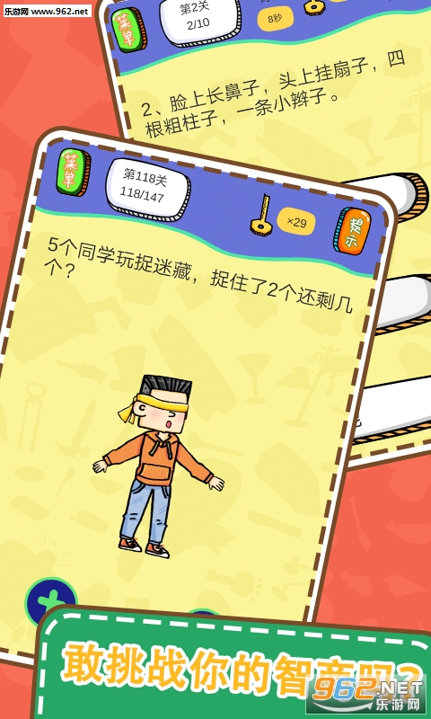 你需要选择出每一关中正确的答案,玩家可以依次用排除法得到最后的正确答案,挑战自己的智商时候到了,玩法操作比较简单、男女老少都可以来锻炼自己的大脑喔,在百变个性的设计关卡中思考吧,如果实在想不出来可以先看看提示内容喔。