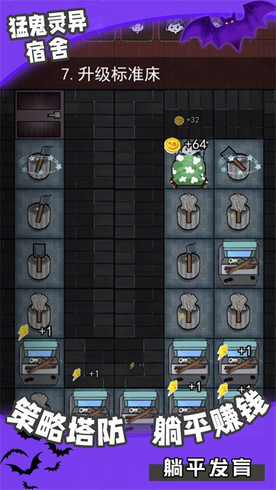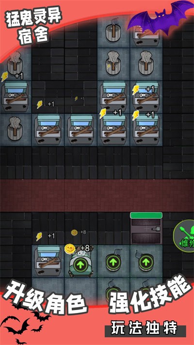猛鬼灵异宿舍是轻恐怖风的休闲塔防对抗类手游,可以体验有趣的塔防射击挑战,积极的参与到游戏中,选择合适的宿舍进行躺平,不断地发育变强。