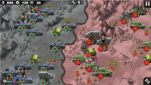陆地单位向左上方推进,先用榴弹炮攻击敌方轻型步兵,再用装甲车攻击可以做到无伤消灭