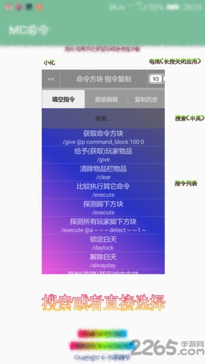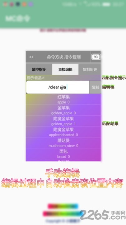mc命令方块手机版Minecraft PE版命令方块命令助手。本app让你简单的使用命令(指令)完成各种事情。以悬浮窗形式在游戏时编辑、复制、粘贴!