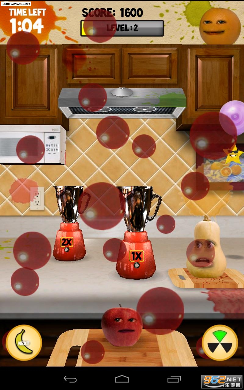 你需要将苹果、香蕉、哈密瓜等水果送到搅拌机中榨成果汁,每种水果都有各种猥琐表情,就连叫声也是极度猥琐,道具方面主要是榨汁机,只要掌握好力度就能把这些猥琐的水果扔进去,然后榨成果汁。